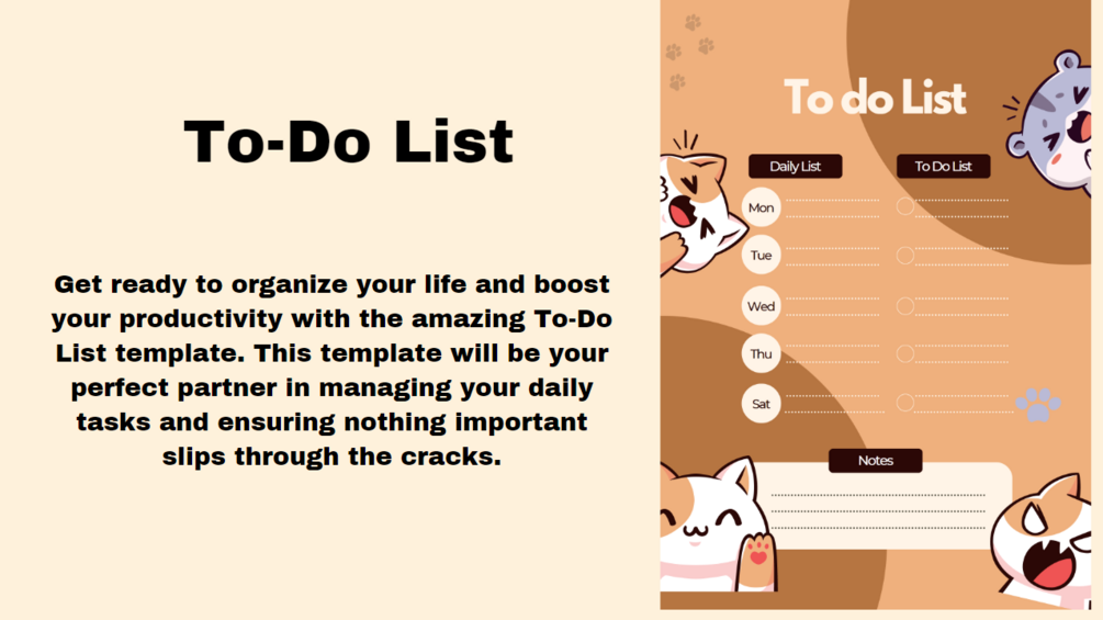 Get ready to organize your life and boost your productivity with the amazing To-Do List template. This template will be your perfect partner in managing your daily tasks and ensuring nothing important slips through the cracks.