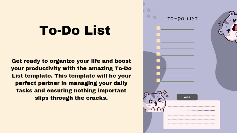 Get ready to organize your life and boost your productivity with the amazing To-Do List template. This template will be your perfect partner in managing your daily tasks and ensuring nothing important slips through the cracks.